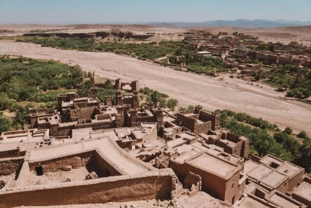Next, explore Aït Benhaddou, an ancient fortified city located in the foothills of the High Atlas Mountains of Morocco. It was once a major trading post on the caravan route between the Sahara Desert and Marrakech and is now a UNESCO World Heritage Site. The kasbah is made up of a series of mud-brick dwellings built in the 11th century and has been used as a filming location for a number of Hollywood movies.